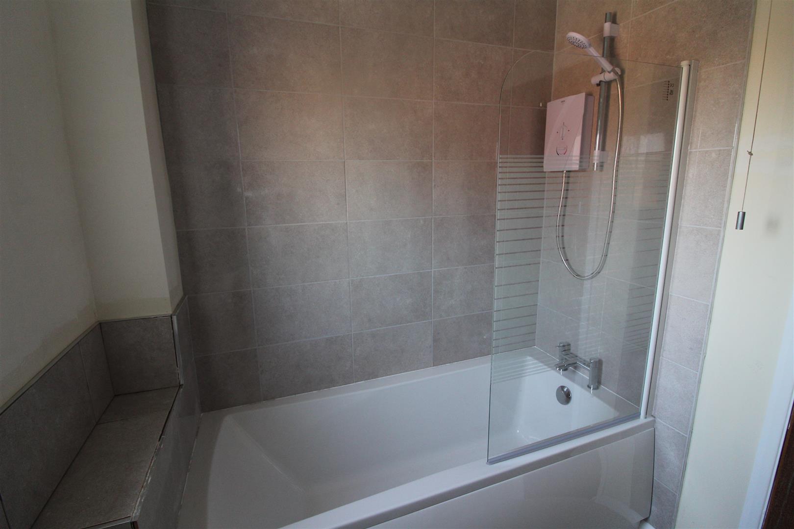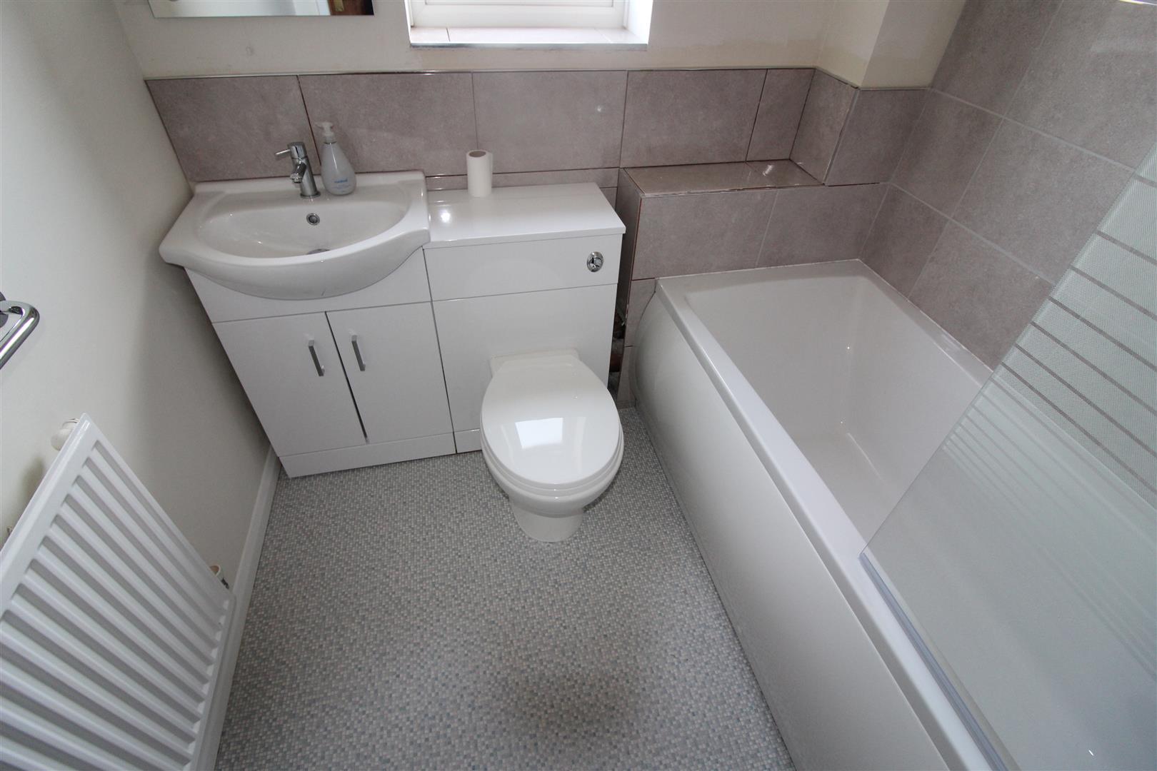 Bathroom - Modern white suite comprising panelled bath with electric shower fitment over, wash hand basin and low level WC. Complementary tiling. Vinyl flooring. Radiator. Electric shaver point. Opaque double glazed window.