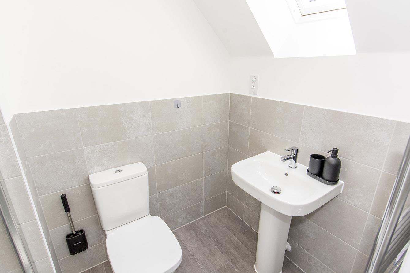 Ensuite Shower Room - Double shower cubicle with main shower fitment. Pedestal wash hand basin. Low level WC. Complimentary tiling. Double-glazed window. Electric shaver point. Wood laminate flooring. Heated towel rail.