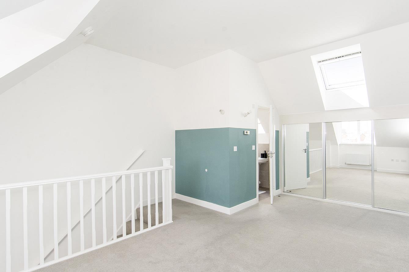 Master Bedroom - 5.89m x 4.19m (19'4" x 13'9") - Double-glazed window to front elevation. Velux window. Built in mirrored wardrobe spanning one wall. Timber balustrade. Two wall lights. Television point. Telephone point. Radiator. Door to ensuite shower room.