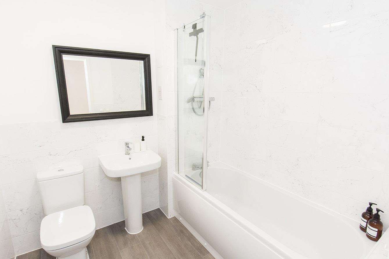 Bathroom - Panelled bath with main shower fitment over. Pedestal wash hand basin and low level WC. Wood laminate flooring. Complimentary tiling. Extractor fan.