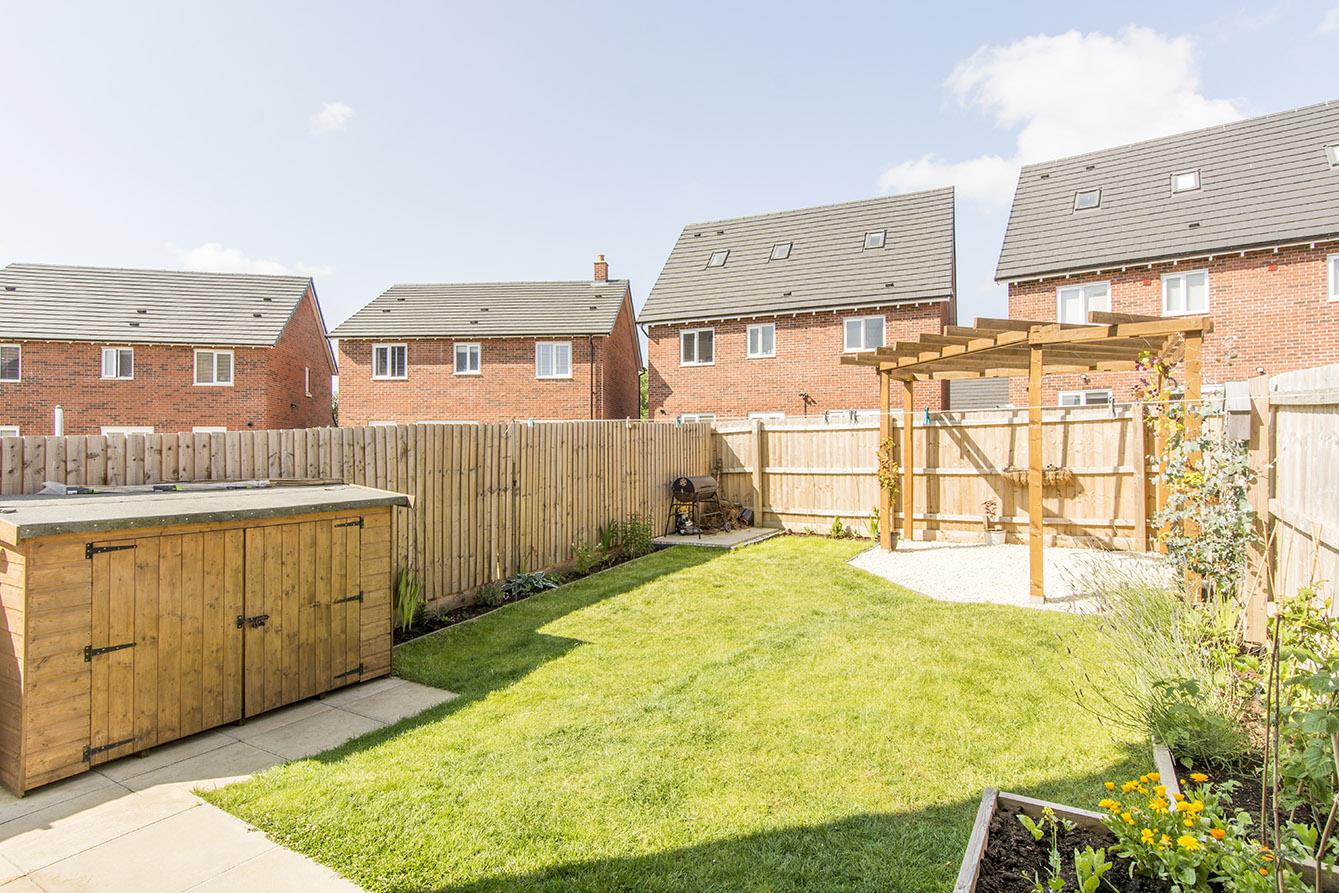 Rear Garden - Laid mainly to lawn with gravelled and pathed patio areas. Enclosed by timber slat fencing. Timber pergola. Garden store.