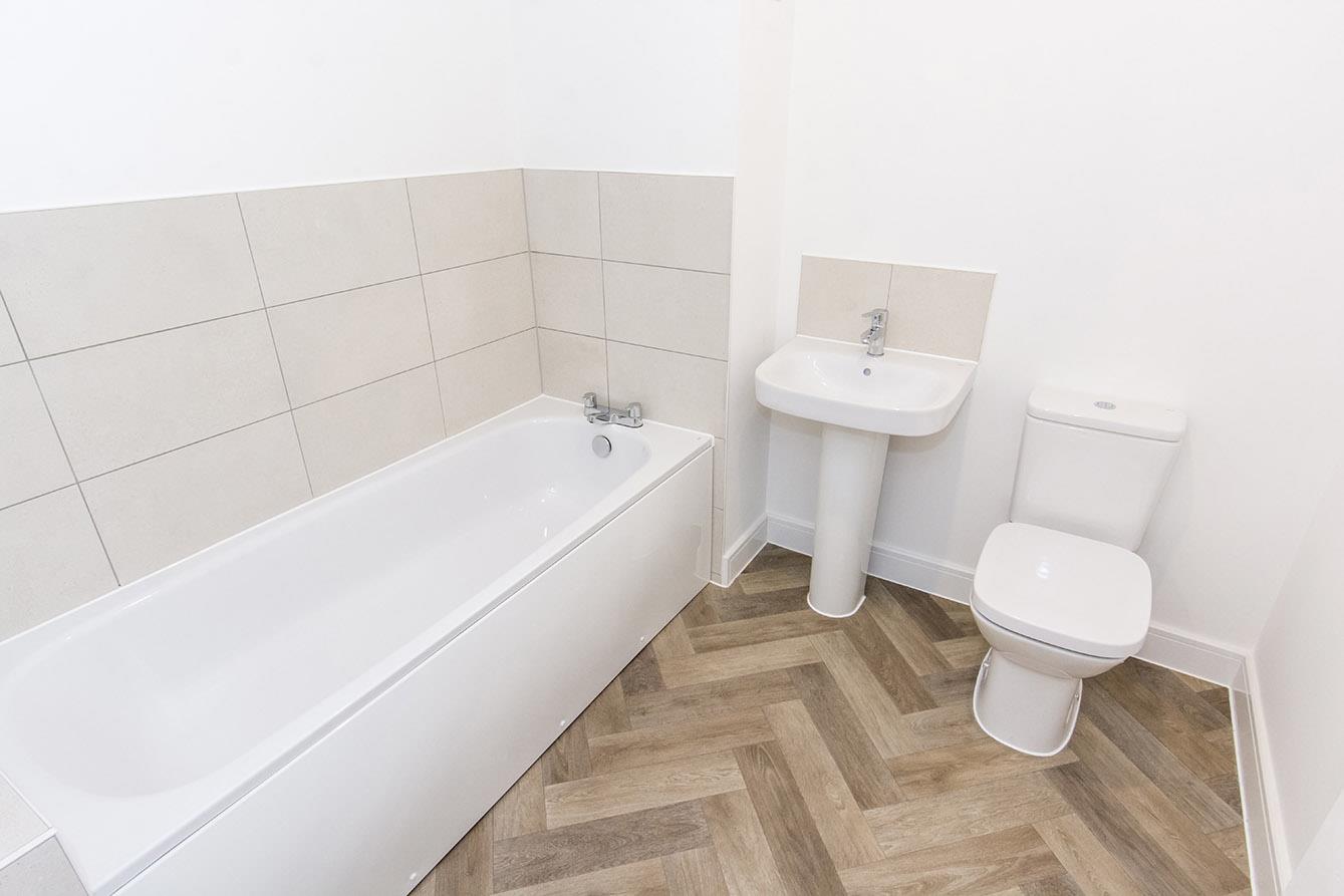 Bathroom - Panelled bath. Pedestal wash hand basin. Low level wc. Complimentary tiling. Karndean flooring. Radiator. Extractor fan.