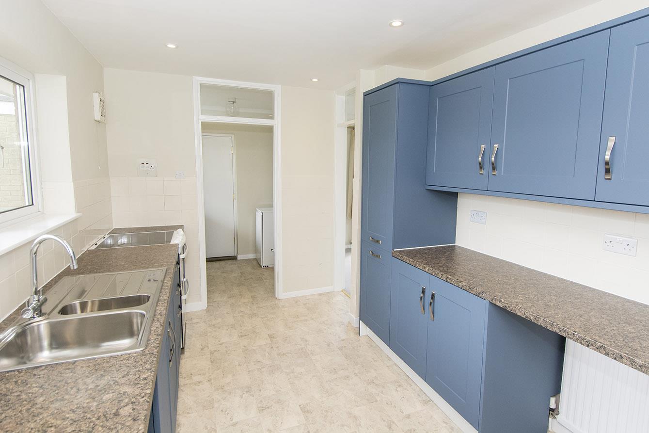 Kitchen - 4.17m x 2.64m (13'8" x 8'8") - Newly fitted kitchen with modern range of base and wall units. Laminated work surfaces with complementary tiled splash backs. Fitted freestanding electric cooker. Stainless steel one and a half sink and drainer. Space and plumbing for automatic dishwasher. Radiator. Double glazed window to the front elevation. Doorway to:-