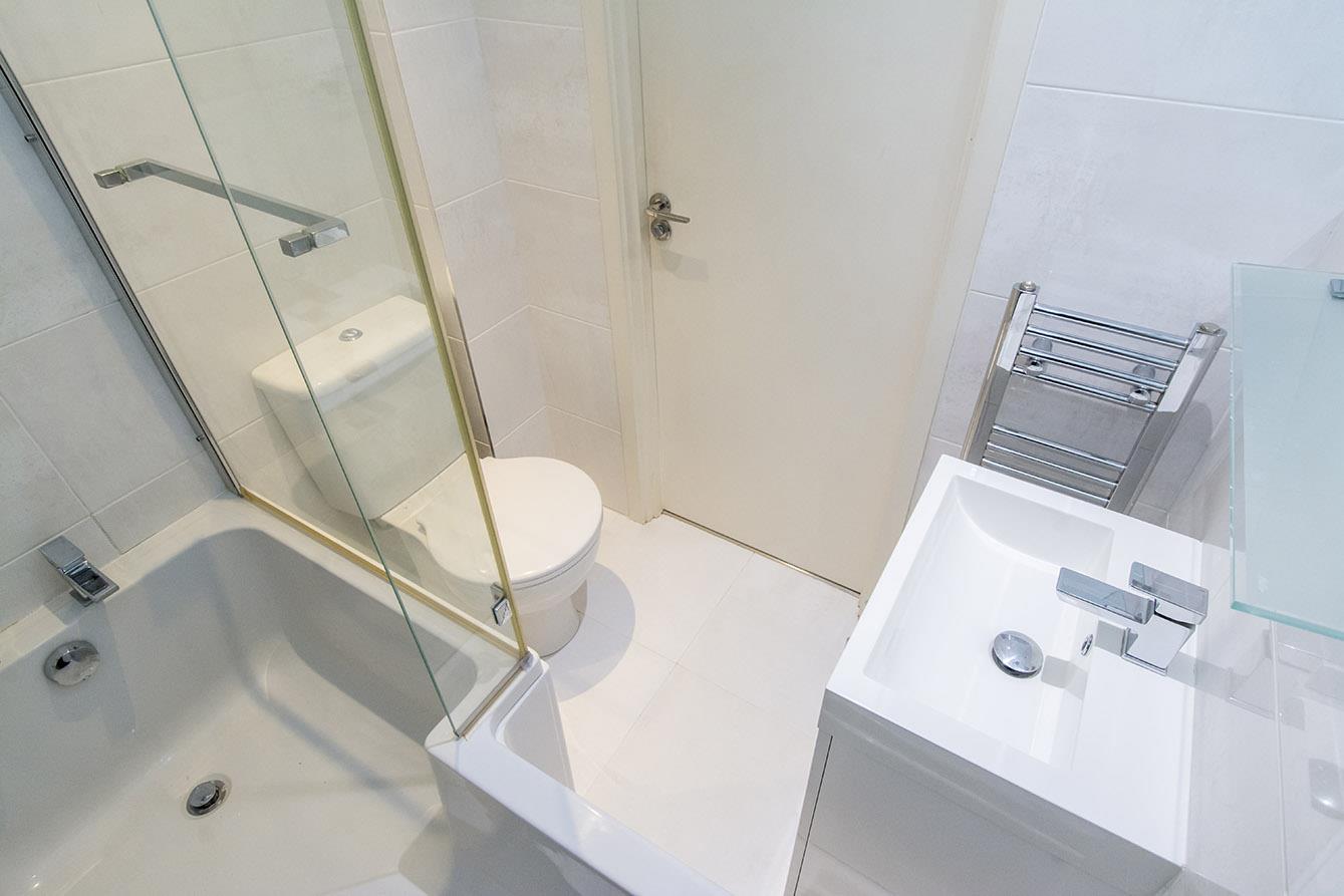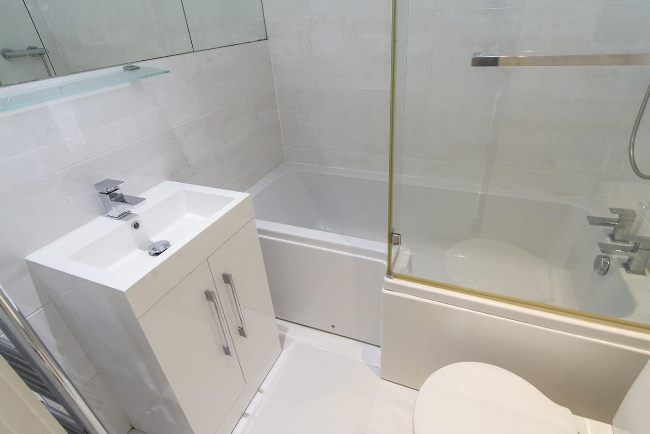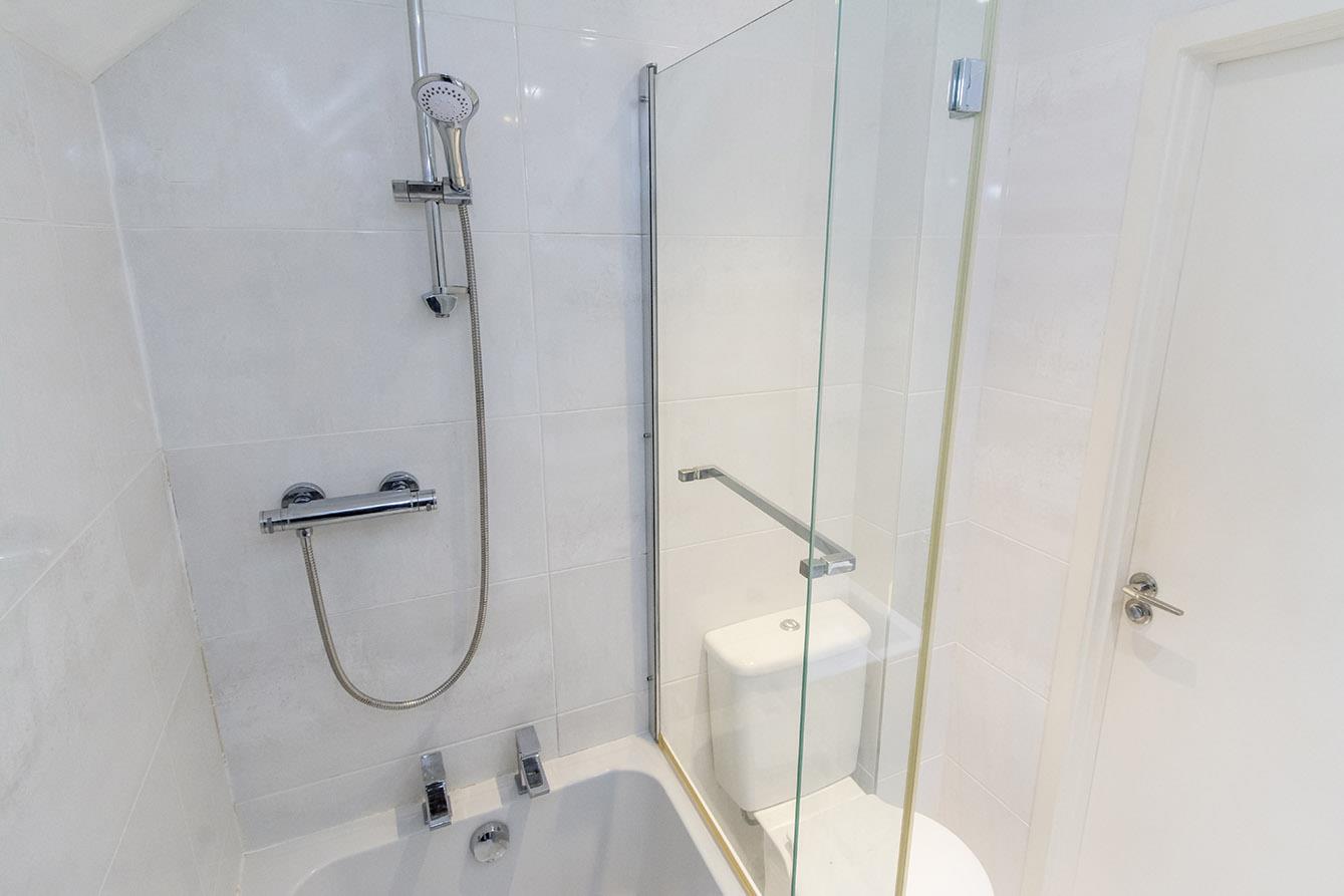 Bathroom - Panelled bath with mains shower fitment over. Wash hand basin. Low level WC. Complementary tiling. Heated towel rail. Extractor fan.