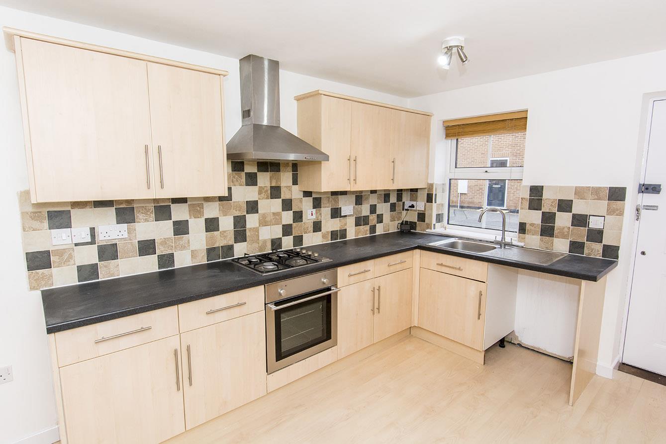 Kitchen Area - 3.76m x 2.77m (12'4" x 9'1") - Accessed via opaque double-glazed composite front door. Wood laminate flooring. Range of fitted base and wall units. Roll edge work surfaces with complementary tiled splash backs. Fitted oven and four ring gas hob with stainless steel extractor hood over. Stainless steel single sink and drainer. Space and plumbing for automatic washing machine. Double-glazed window to the front elevation. Radiator. Opening to stairs rise in to the first floor. Door to cloakroom/wc. Opening to living room area.