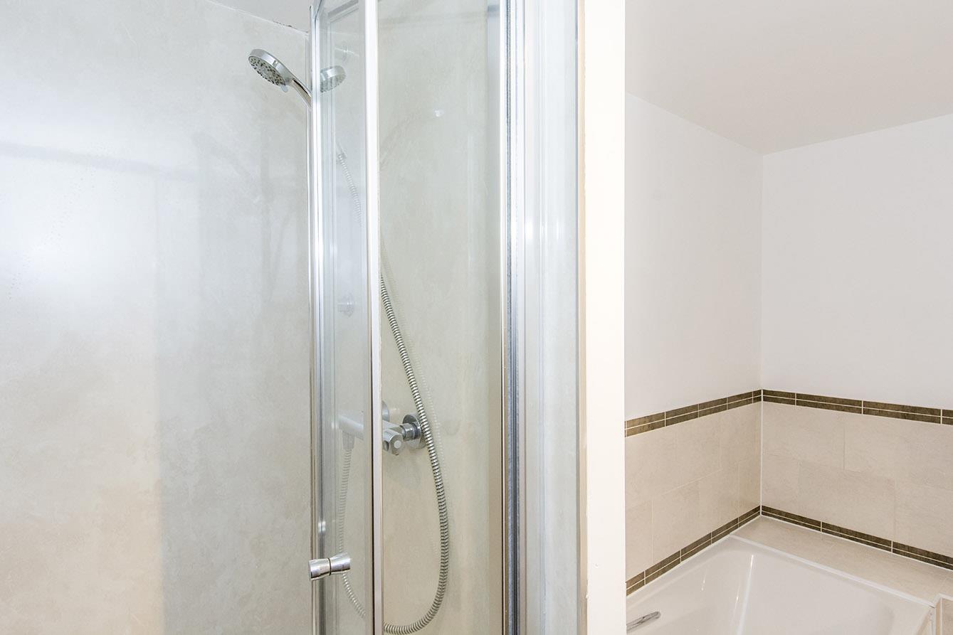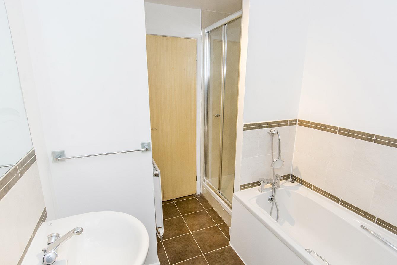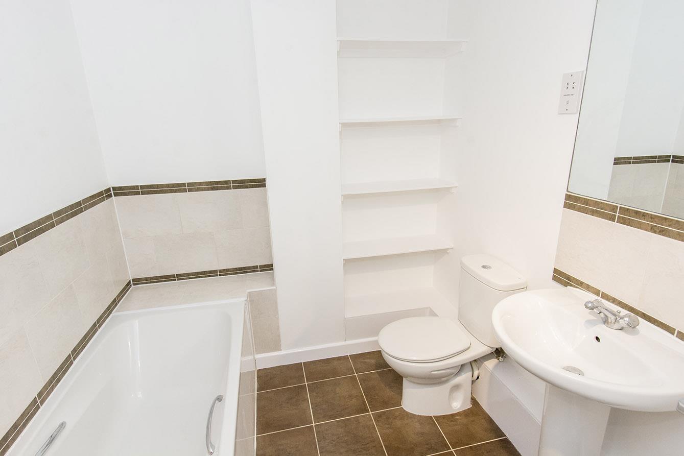 Bathroom - Tiled shower cubicle with main shower fitment. Panelled bath with shower attachment. Pedestal wash hand basin. Low level wc. Complimentary tiling. Tiled affect vinyl flooring. Electric shaver point. Radiator. Fitted shelving.
