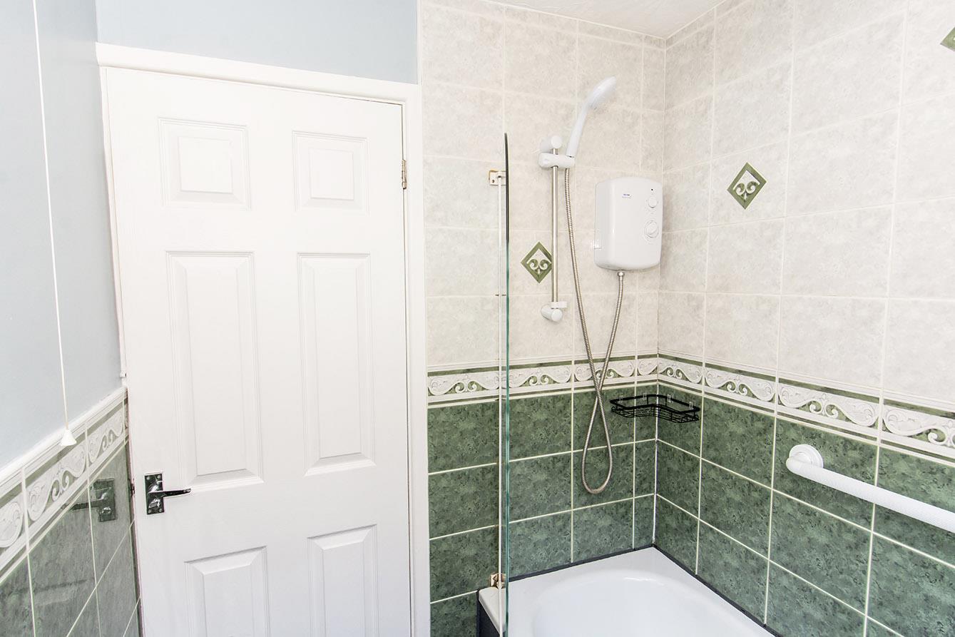 Bathroom - Panelled bath with electric shower fitment over. Wash hand basin. Complimentary tiling. Radiator. Opaque double-glazed window.