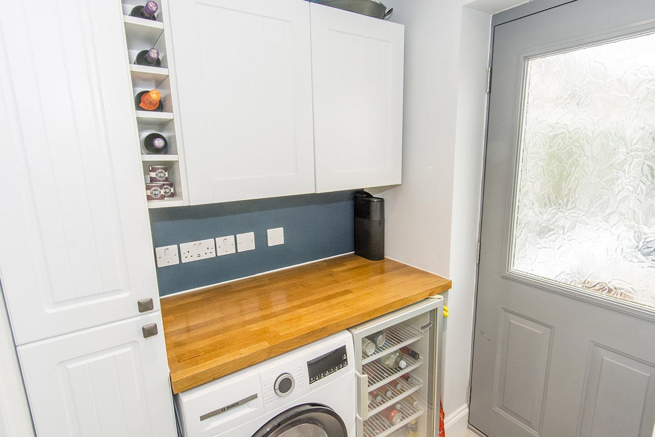 Utlity - 1.47m x 1.50m (4'10" x 4'11") - Fitted base and wall units. Timber work surface. Space and plumbing for automatic washing machine. Tiled flooring with underfloor heating. Opaque double glazed door to the conservatory. Door to:-