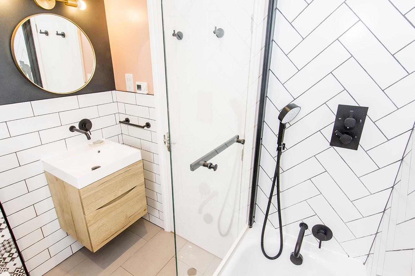 Bathroom - Panelled bath with mains 'Rain' shower fitment over. Wash hand basin. Low level WC. Complementary tiled floor, with underfloor heating, and walls. Heated towel rail. Electric shaver point. Opaque double glazed window.