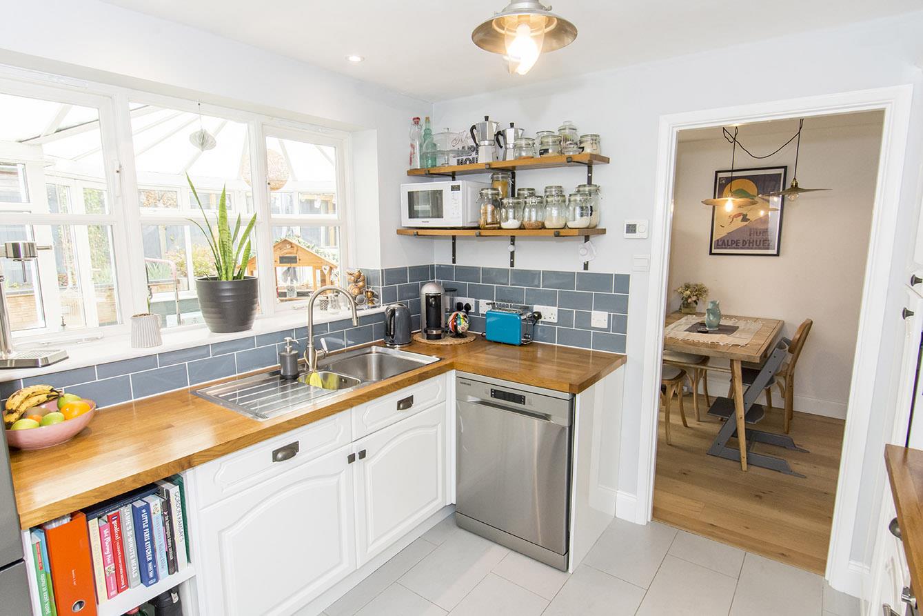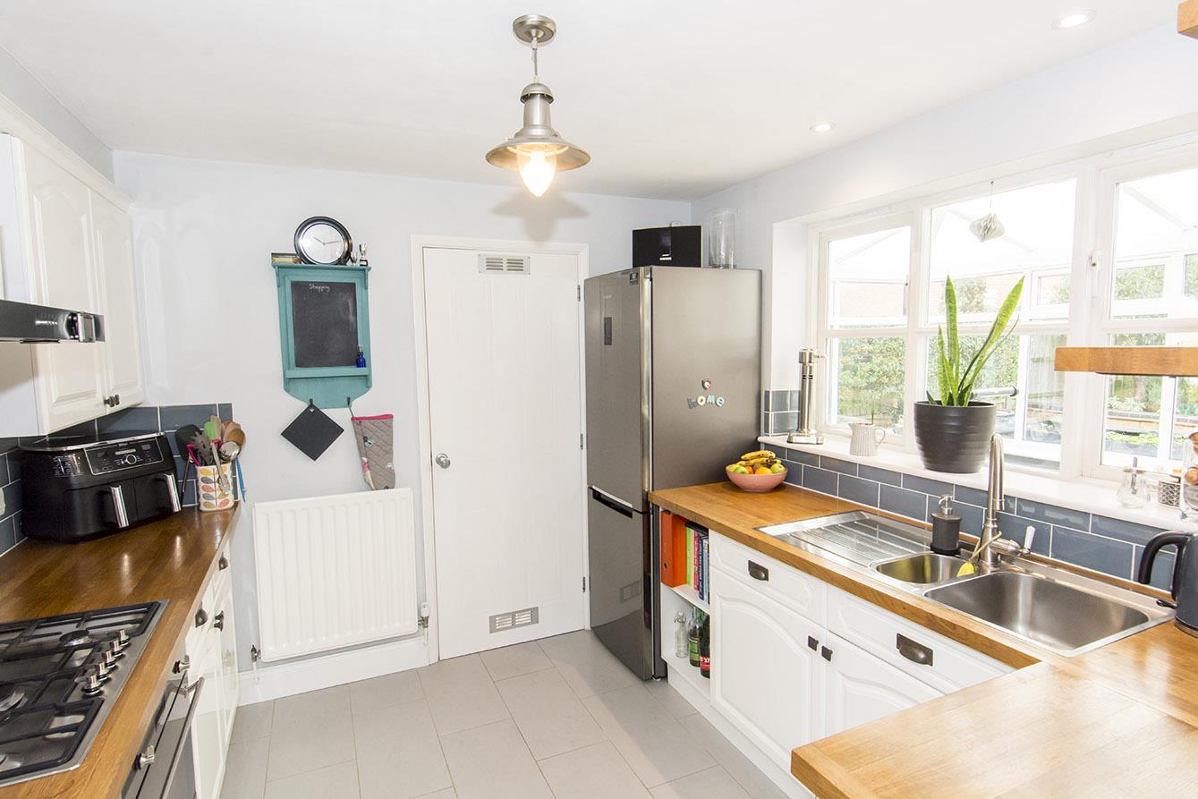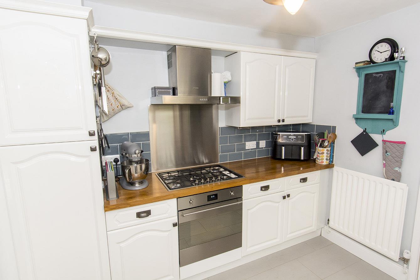 Kitchen - 2.87m x 2.82m (9'5" x 9'3") - Re-fitted kitchen with modern range of fitted base and wall units. Solid timber work surfaces with complementary tiled splash backs. Fitted oven and five ring gas hob with stainless steel extractor hood and splash back. Stainless steel sink and drainer. Space and plumbing for automatic dishwasher. Space for upright fridge/freezer. Tiled flooring with underfloor heating. Vertical radiator. Window to the rear aspect. Door to:-