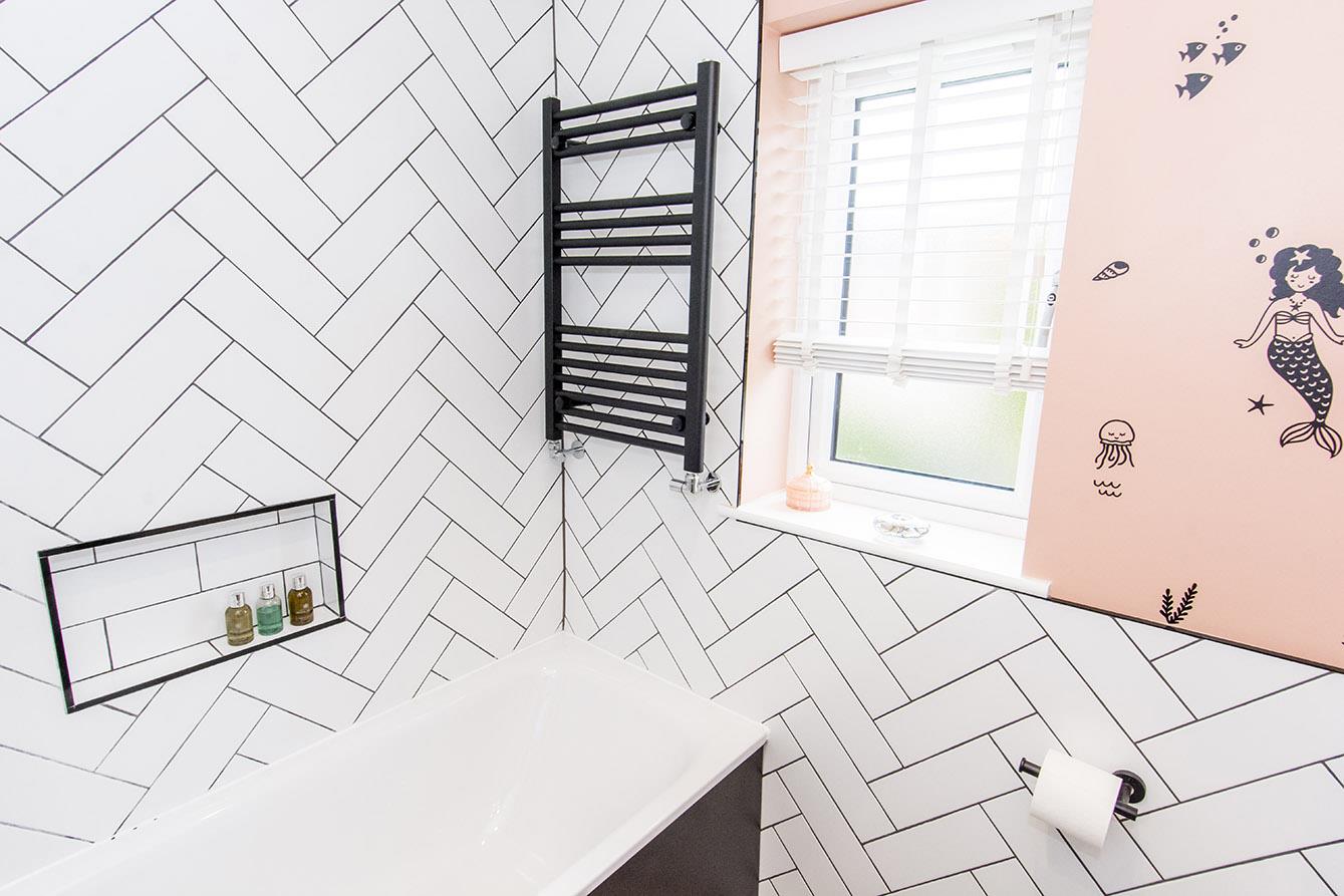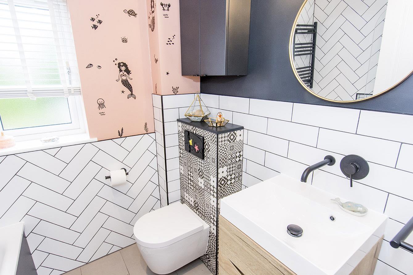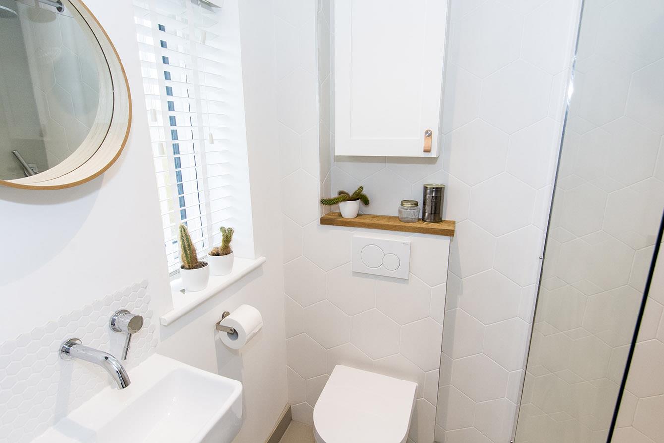 Downstairs Wc - Wash hand basin and low level WC. Complementary tiled floor, with underfloor heating, and walls. Radiator. Opaque double glazed window.