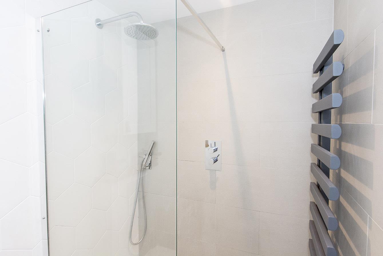 En-Suite Shower Room - Double shower cubicle with mains 'Rain' shower fitment and glass screen. Wash hand basin. Low level WC. Complementary tiled floor, with underfloor heating, and walls. Vertical radiator. Opaque double glazed window.