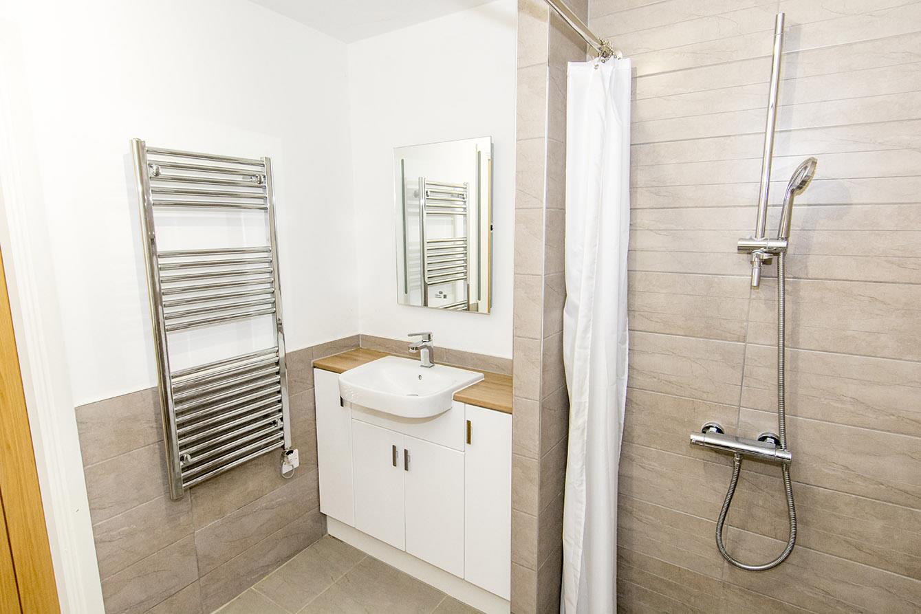 Wet Room - 2.24 x 2.11 - 7' 4" x 6' 11" (2.24m x 2.11m) Comprising: Shower, hand basin with vanity storage below and mirror above, low level WC. Chrome heated towel rail. Feature tiling to walls and floor.
