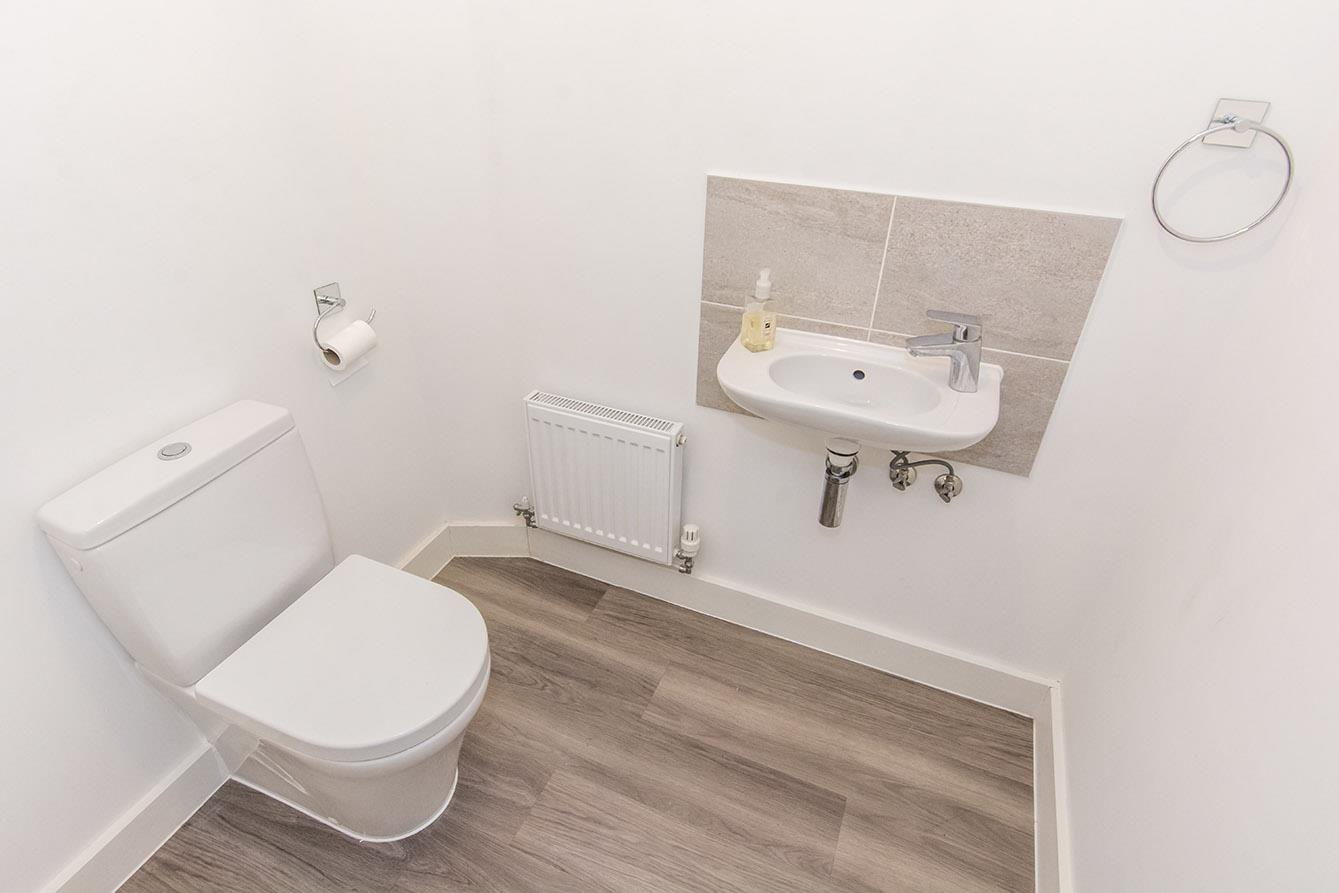 Cloakroom/Wc - Wash hand basin. Low level wc. Radiator. Wood effect laminate flooring. Extractor fan.