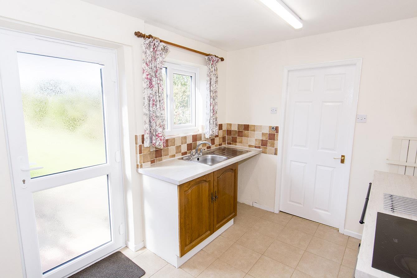 Kitchen - 3.61m x 2.54m (11'10" x 8'4") - Range of medium oak facing fitted base and wall units to include glazed display cabinets. Laminated work surfaces with complementary tiled splash backs. Fitted oven and four ring electric hob with extractor hood over. Stainless steel sink and drainer. Ceramic tiled flooring. Double glazed window to the rear aspect. Opaque double glazed door opening out to the rear garden. Archway to:-