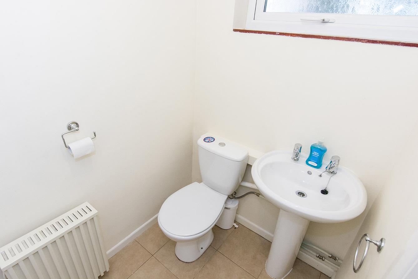 Downstairs Wc - Pedestal wash hand basin and low level WC. Radiator. Opaque double glazed window. Door to:-