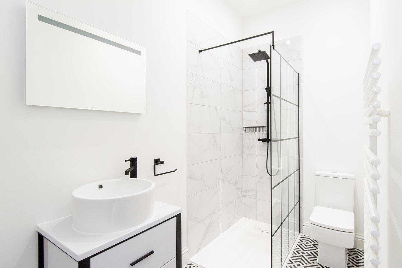 Shower Room - 3.18m x 1.47m (10'5" x 4'10") - Large open shower cubicle with 'Rain' shower fitment. Wash hand basin. Low level WC. Heated towel rail. Complementary tiled floor and walls.