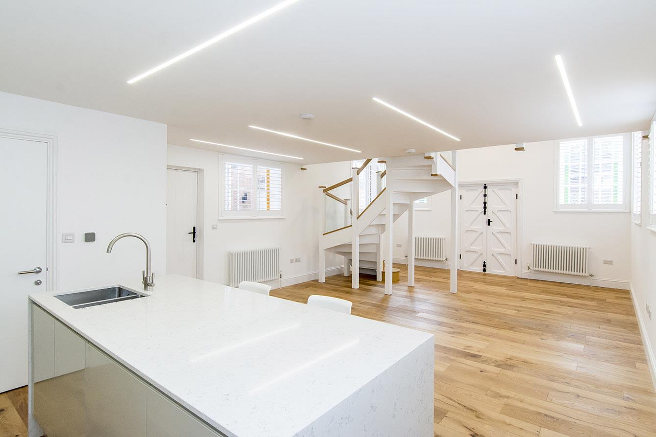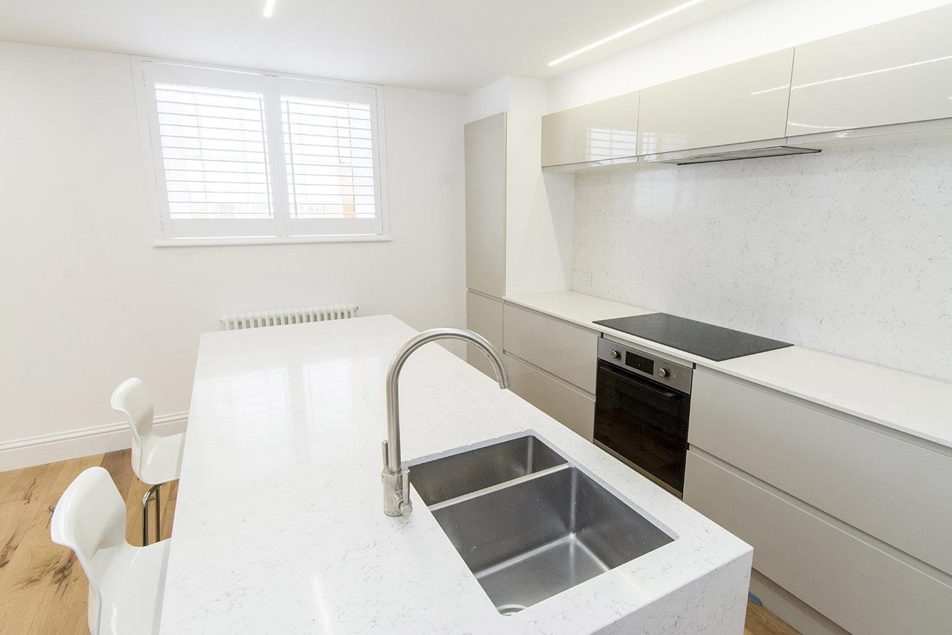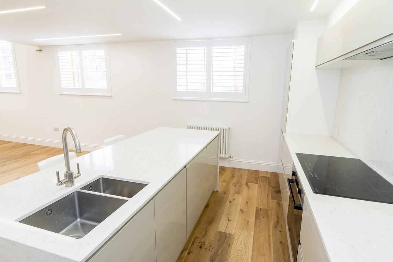 Kitchen Area - Fitted base and wall units. White quartz work surfaces and splash backs. Further large island with base units and quartz work top. Stainless steel double sink and drainer. Fitted appliances to include: Oven and four ring electric hob with extractor hood over, automatic dishwasher, fridge and freezer. Column radiator.